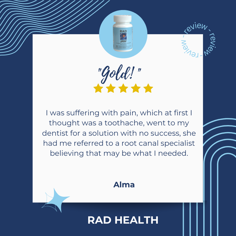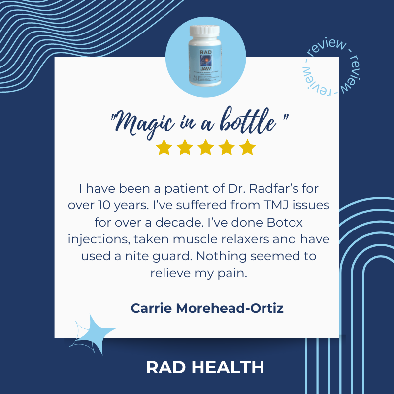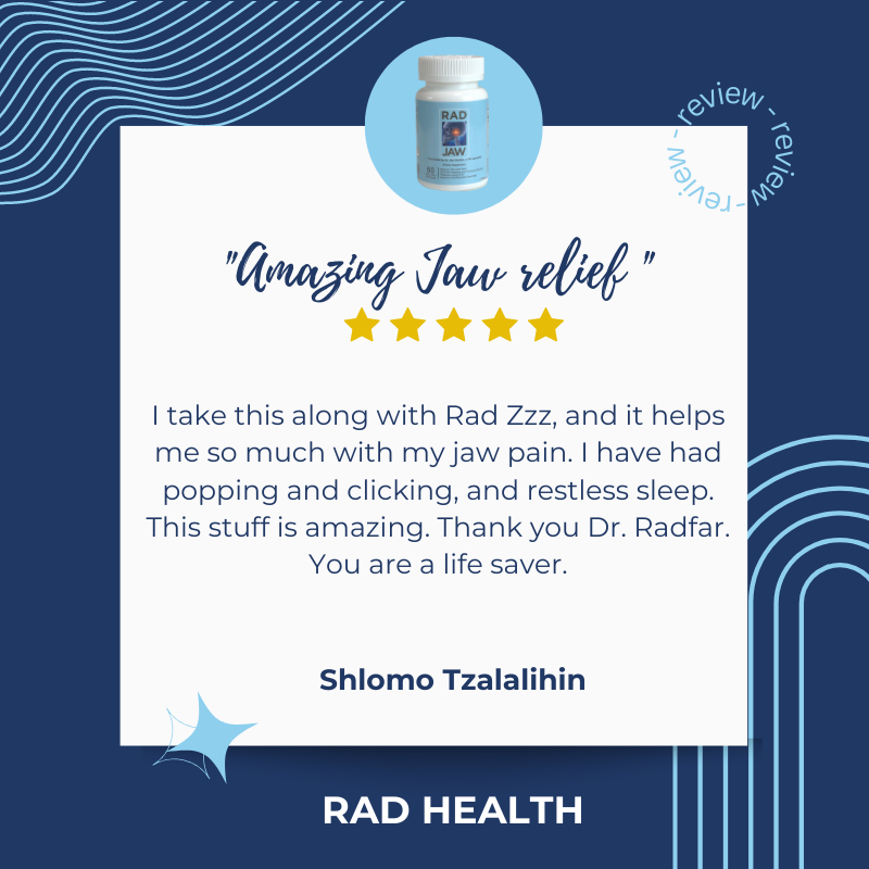 "I take this along with Rad Zzz, and it helps me so much with my jaw pain. I have had popping and clicking, and restless sleep. This stuff is amazing. Thank you Dr. Radfar. You are a life saver."